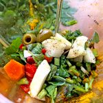 - Een hoge kom en daarin doe je de olijven, de hete peper, knoflook en ui fijn gesneden, de verse kurkuma in stukken, de poeder erbij, de peterselie gewassen en nadat je er 2 cm van de steeltjes hebt afgesneden, in stukjes ook in de kom. De olijfolie erbij en pureer totdat het een mooie puree is. Doe er als laatst oregano blaadjes bij, roer het goed door.