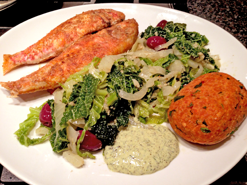 Mul met gestoomde venkel en groene kool. Makkelijker en sneller kan het bijna niet. De mul is in een meel laagje gebakken, de venkel met groene kool stoomd in een pasta pan en de linzen bal komt van de Oosterse winkel. Veel smaken en genoeg groenten. Nb een saus van mayonaise, yochurt en dille pesto is zo gemaakt.