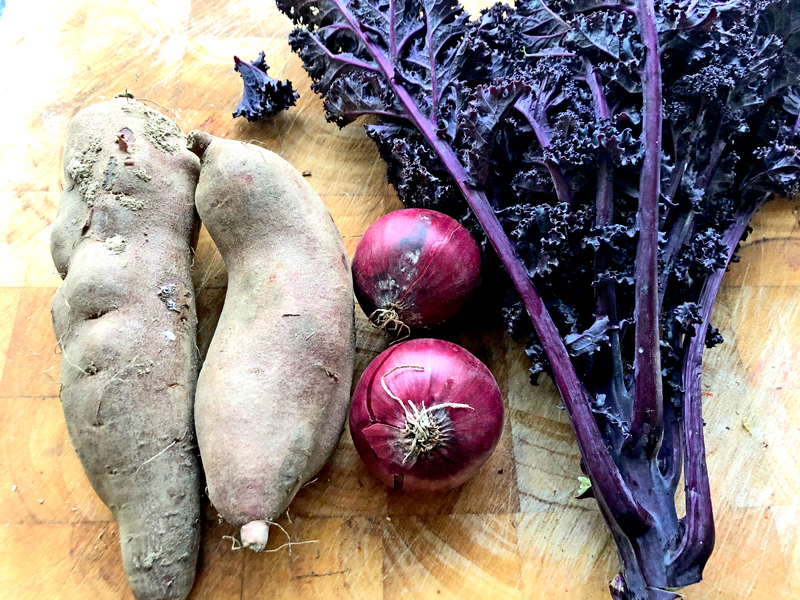 Paarse boerenkool met zoete aardappel en een kiprollade. Het gemak van je groenten roosteren is dat de oven het werk doet. Kruid de groenten goed en je hebt een smakelijk resultaat. De kiprollade is gemaakt van ‘plat geslagen’ kipfilet, gevuld en gebakken.
