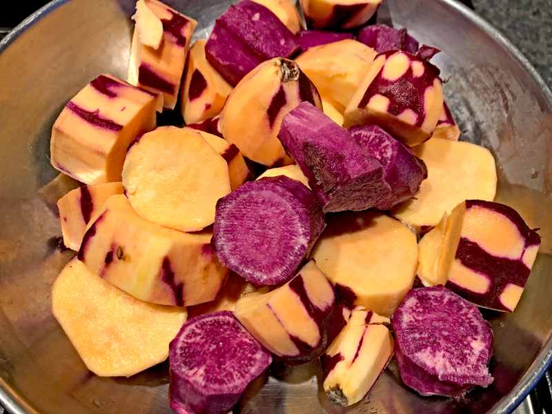 - Start met het schillende van de zoete aardappels en blanceer ze in heet kokend water, met zout, voor ca 8/10 minuten. Prak de zoete aardappel met wat olijfolie en doe er de rode hete peper, knoflook en oragano er bij en roer het goed door de puree heen.